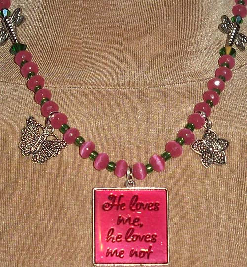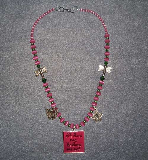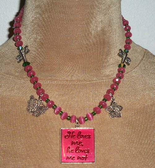 Necklace: Raspberry cat's eye glass mixed with emerald green crystals. Gragonfly, Butterfly & flower charms. Message Medallion. Lobtser Claw clasp