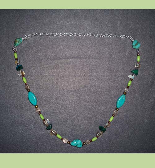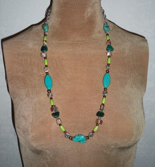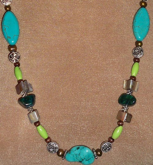 Necklace: Dyed 'Turquoise' Magnesite, Lime Chalk Magnesite, Mother of Pearl, Bronze Fresh Water Pearls, wood & shiny metal beads