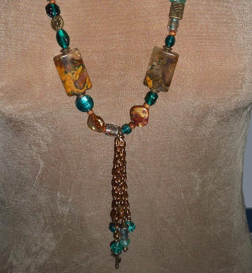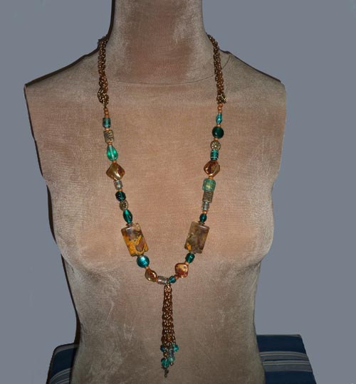 Necklace: Green glass beads, Mother of Pearl, multiple chains, wood & metal beads