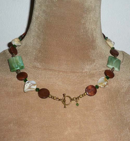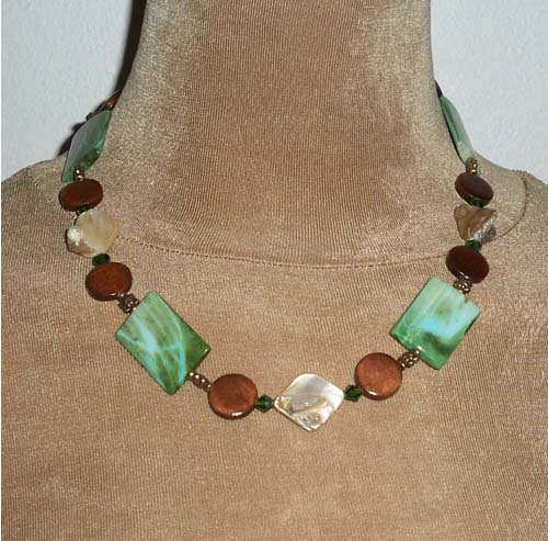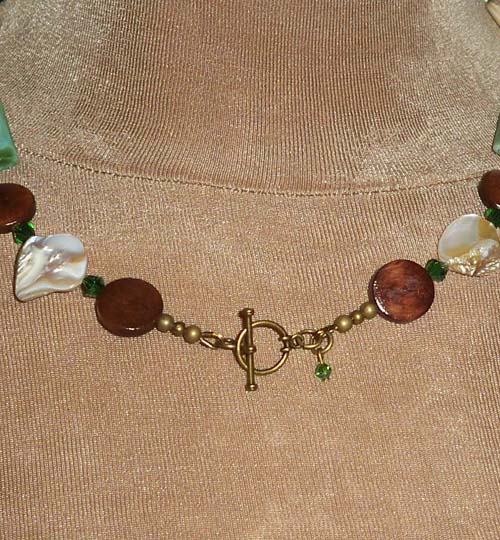 Necklace: Mother of Pearl, Wood, Acrylic, Brass, Crystals
